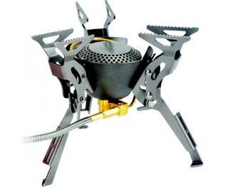 Туристическая газовая горелка со шлангом для выноса баллона. Используется с резьбовыми сменными картриджами любых типов, возможно подсоединение к цанговому баллону при помощи адаптера. Регулятор мощности на шланге. Двухфазная система подогрева топлива. Система предотвращения потери топлива (ниппель). Складные лапки-держатели. Мощность: 2450 Вт. Расход топлива: 174 г/ч. Время закипания 1 л воды: 3.55 мин. Материал: титан. Размеры в сложенном виде: 96.6x70.2 мм. Вес: 199 г